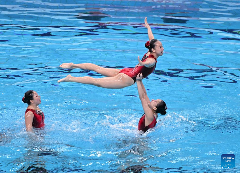 Team China compete during the team acrobatic final at World Aquatics Artistic Swimming World Cup 2024 in Beijing, China, April 7, 2024. (Xinhua/Xia Yifang)