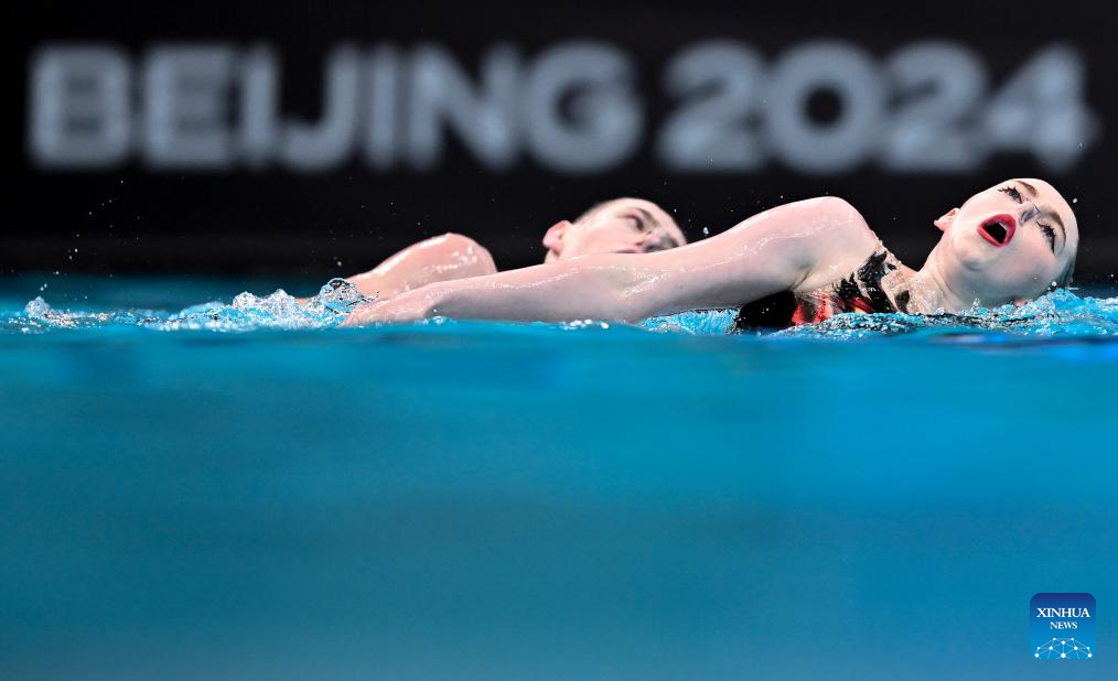 Florence Lily Blinkhorn/Eve Young of Britain compete during the women duet free final at the World Aquatics Artistic Swimming World Cup 2024 in Beijing, capital of China, April 7, 2024. (Xinhua/Xia Yifang)
