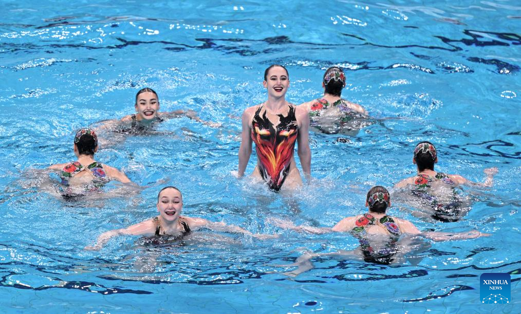 Team Australia compete during the team acrobatic final at World Aquatics Artistic Swimming World Cup 2024 in Beijing, China, April 7, 2024. (Xinhua/Xia Yifang)