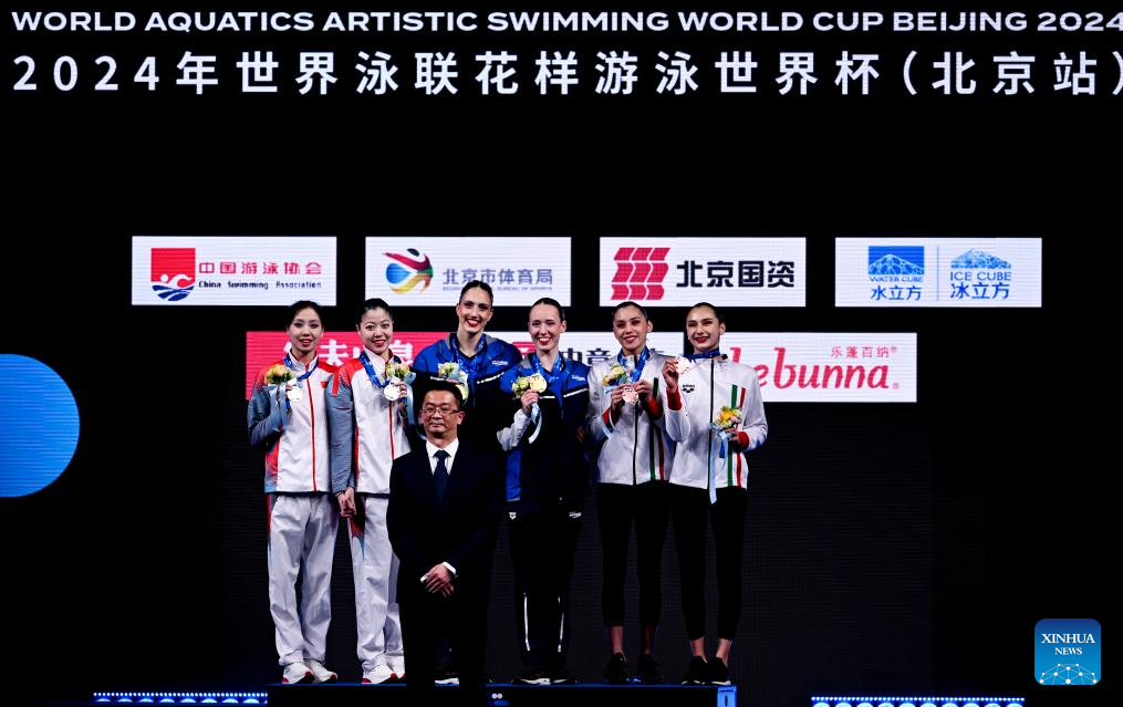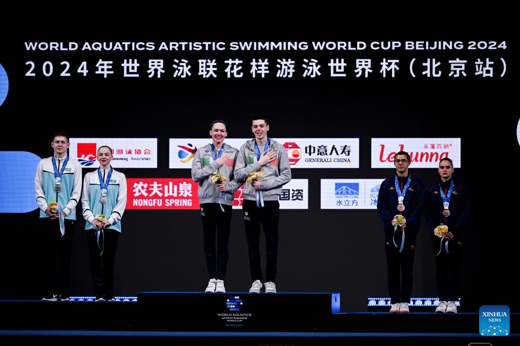 Gold medalists Filippo Pelati (3rd R)/Flaminia Vernice (3rd L) of Italy, silver medalists Viktor Druzin (1st L)/Anna Pavletsova (2nd L) of Kazakhstan and bronze medalists Jordi Caceres Iglesias (2nd R)/Judith Calvo Requena of Spain pose during the awarding ceremony for the mixed duet free event at the World Aquatics Artistic Swimming World Cup 2024 in Beijing, capital of China, April 7, 2024. (Xinhua/Xia Yifang)