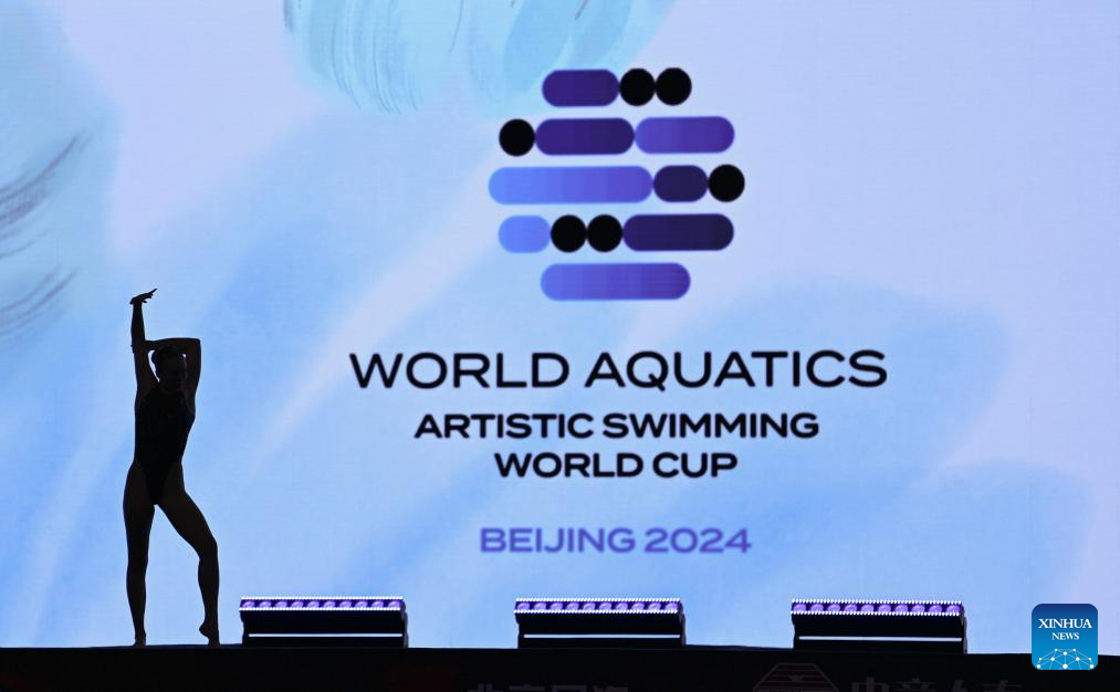 A representative of team Kazakhstan performs during the Gala at the World Aquatics Artistic Swimming World Cup 2024 in Beijing, capital of China, April 7, 2024. (Xinhua/Xia Yifang)