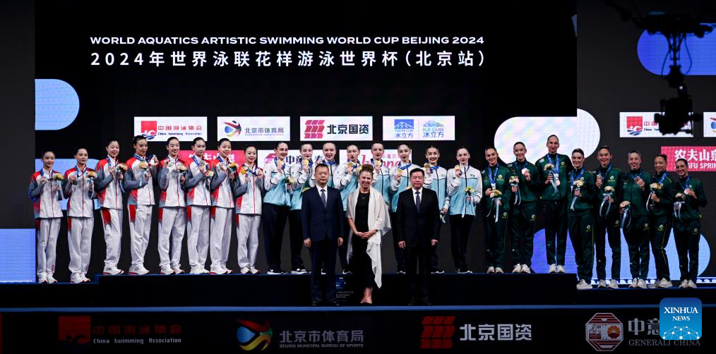 Gold medalists team Kazakhstan (top C), silver medalists team China (top L) and bronze medalists team Australia (top R) pose for photos during the awarding ceremony for the team acrobatic event at World Aquatics Artistic Swimming World Cup 2024 in Beijing, China, April 7, 2024. (Xinhua/Xia Yifang)