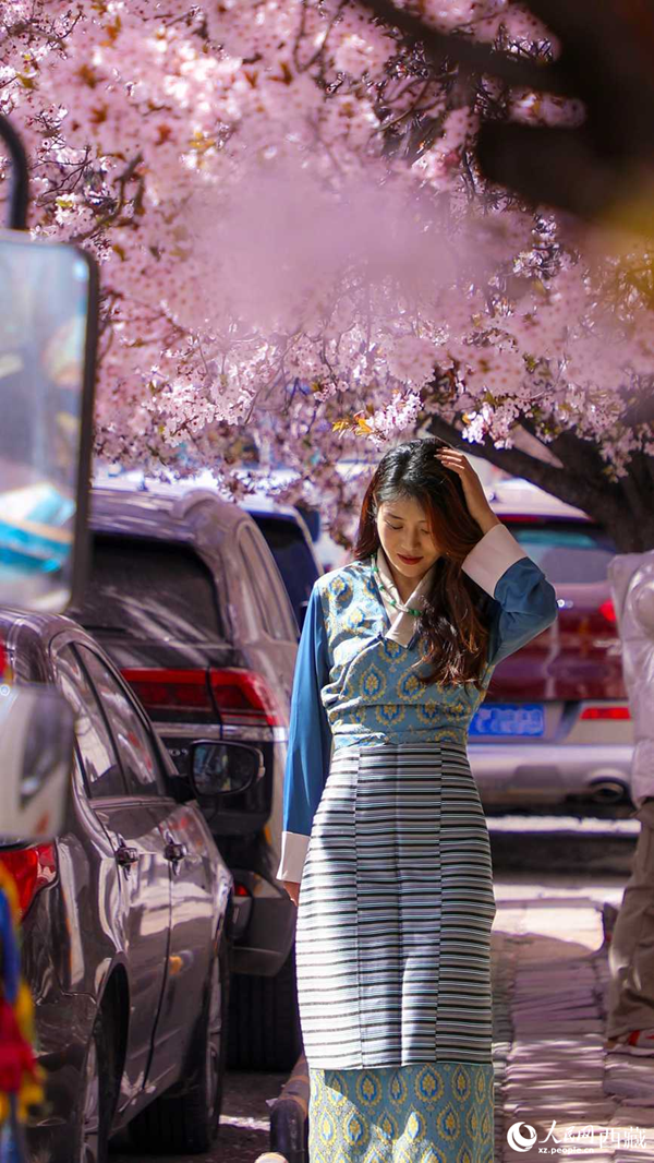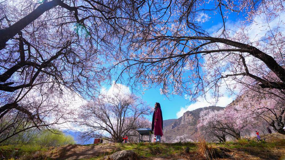 A woman poses for a picture under a peach tree in full bloom in Lhasa, southwest China's Xizang Autonomous Region. (People's Daily Online/Tsering Norbu)
