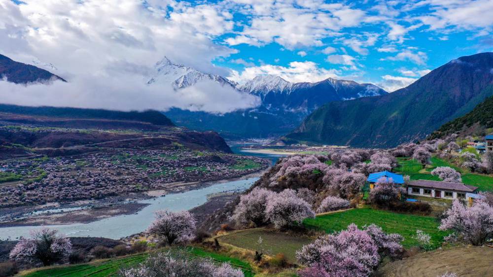 Photo shows blooming peach flowers and snow-capped mountains in Nyingchi, southwest China's Xizang Autonomous Region. (Photo/Zhang Zekun)