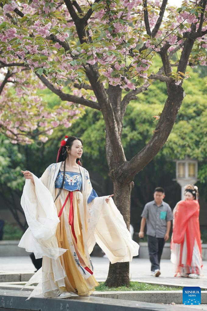 A girl in traditional Chinese costumes poses for photos at the Giant Wild Goose Pagoda scenic area in Xi'an, northwest China's Shaanxi Province, April 8, 2024. (Xinhua/Shao Rui)