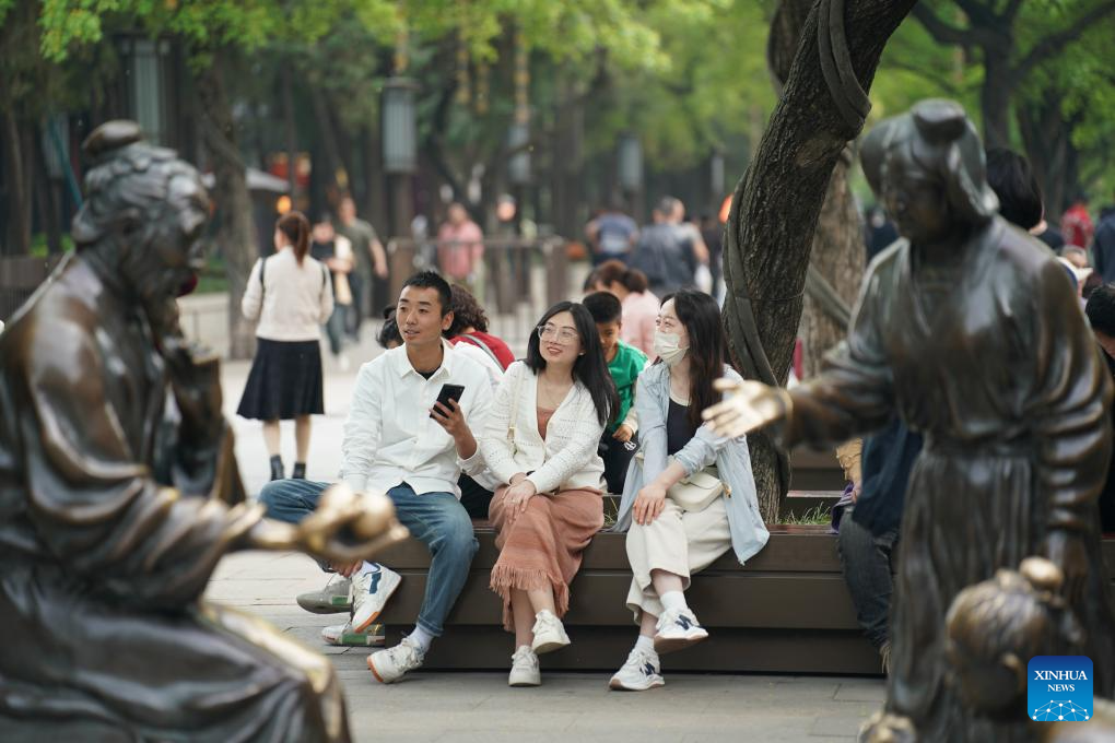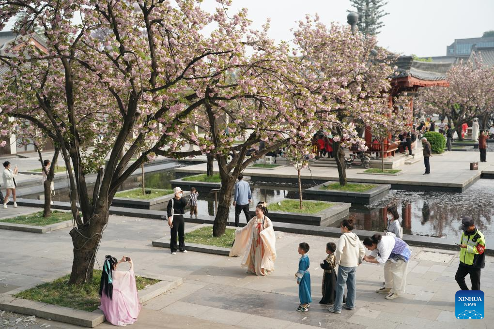 People enjoy themselves at the Giant Wild Goose Pagoda scenic area in Xi'an, northwest China's Shaanxi Province, April 8, 2024. (Xinhua/Shao Rui)