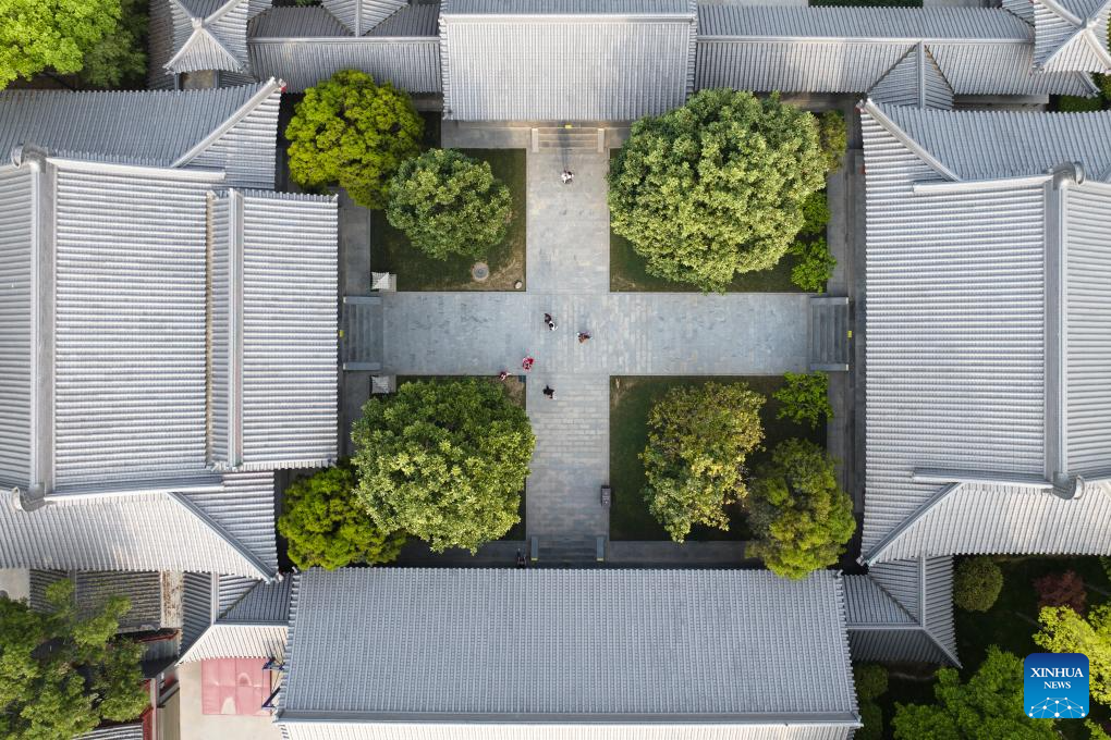 An aerial drone photo taken on April 8, 2024 shows tourists visiting the Da Ci'en Temple in Xi'an, northwest China's Shaanxi Province. (Xinhua/Shao Rui)