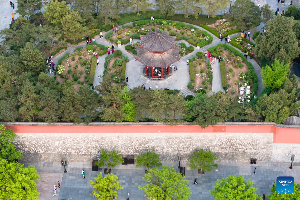 An aerial drone photo taken on April 8, 2024 shows people enjoying leisure time at a park in Xi'an, northwest China's Shaanxi Province. (Xinhua/Shao Rui)