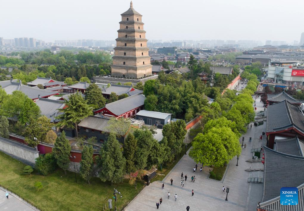 An aerial drone photo taken on April 8, 2024 shows a view of the Giant Wild Goose Pagoda scenic area in Xi'an, northwest China's Shaanxi Province. (Xinhua/Shao Rui)