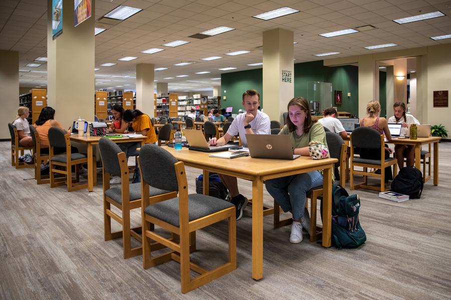 Students are seen at a library of Baylor University in Waco, Texas, the United States, on Aug. 28, 2022. (Photo by Xin Jin/Xinhua)