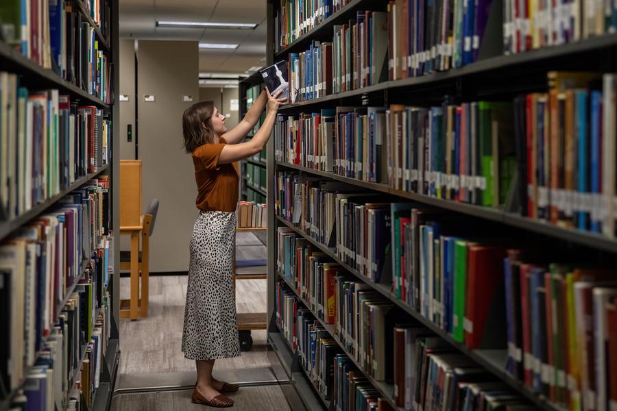 A work-study student restocks a bookshelf with books that students have returned at Baylor University in Waco, Texas, the United States, on Aug. 28, 2022. (Photo by Xin Jin/Xinhua)