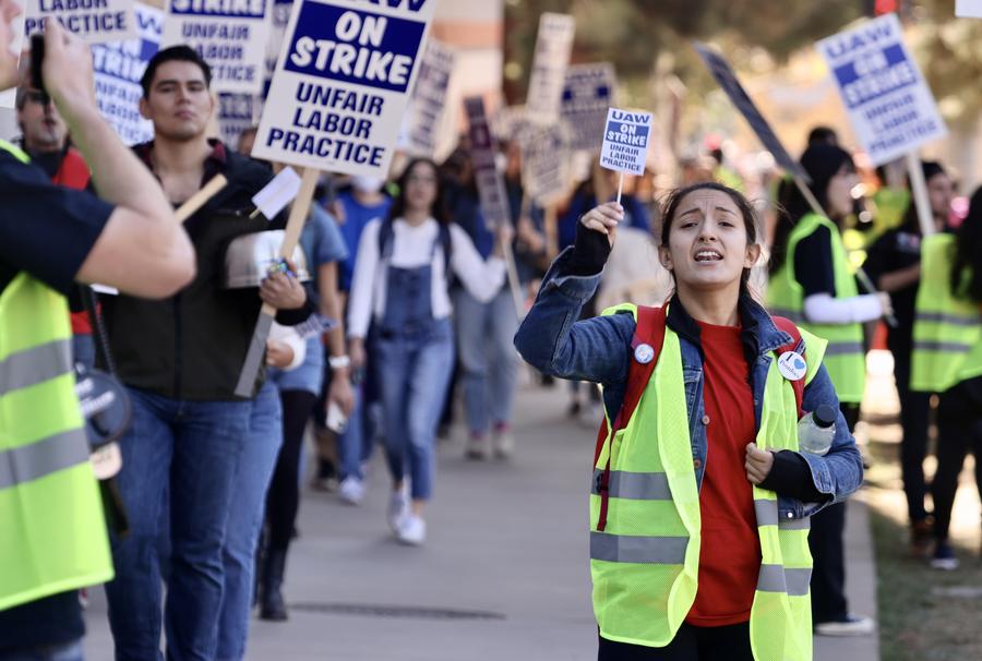 People take part in a protest on campus of the University of California, Los Angeles (UCLA) in Los Angeles, California, the United States, on Nov. 14. 2022. Tens of thousands of academic workers at the University of California (UC) system went on strike for higher wages and better working conditions. (Xinhua)