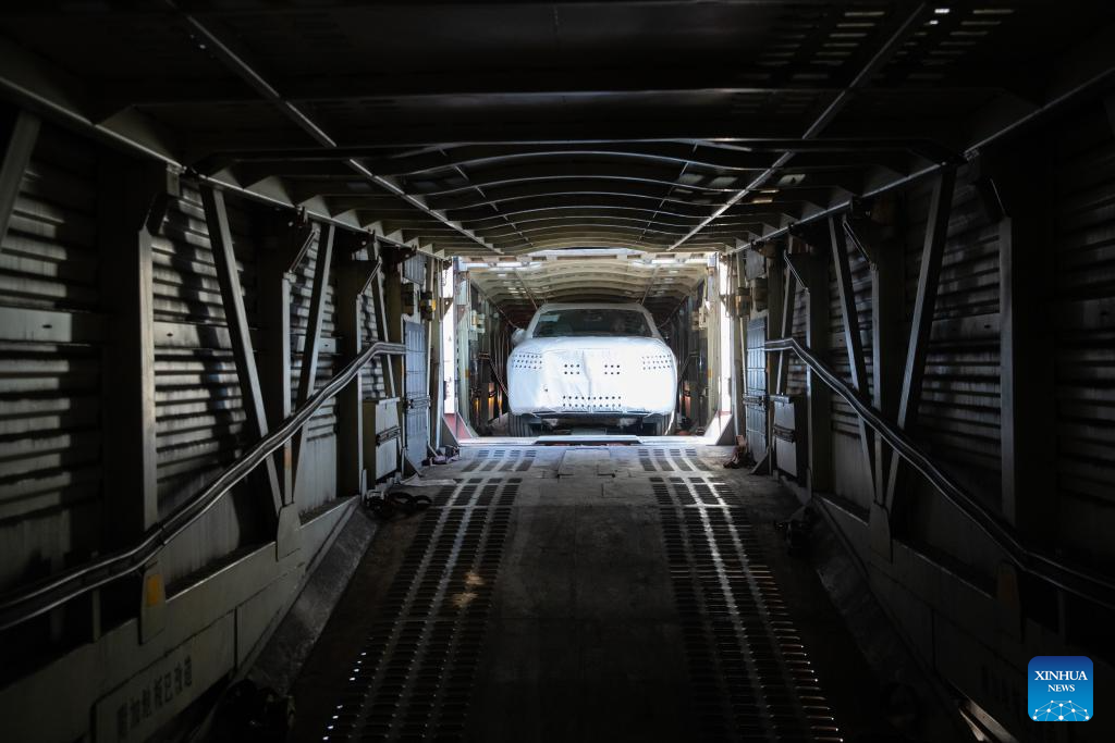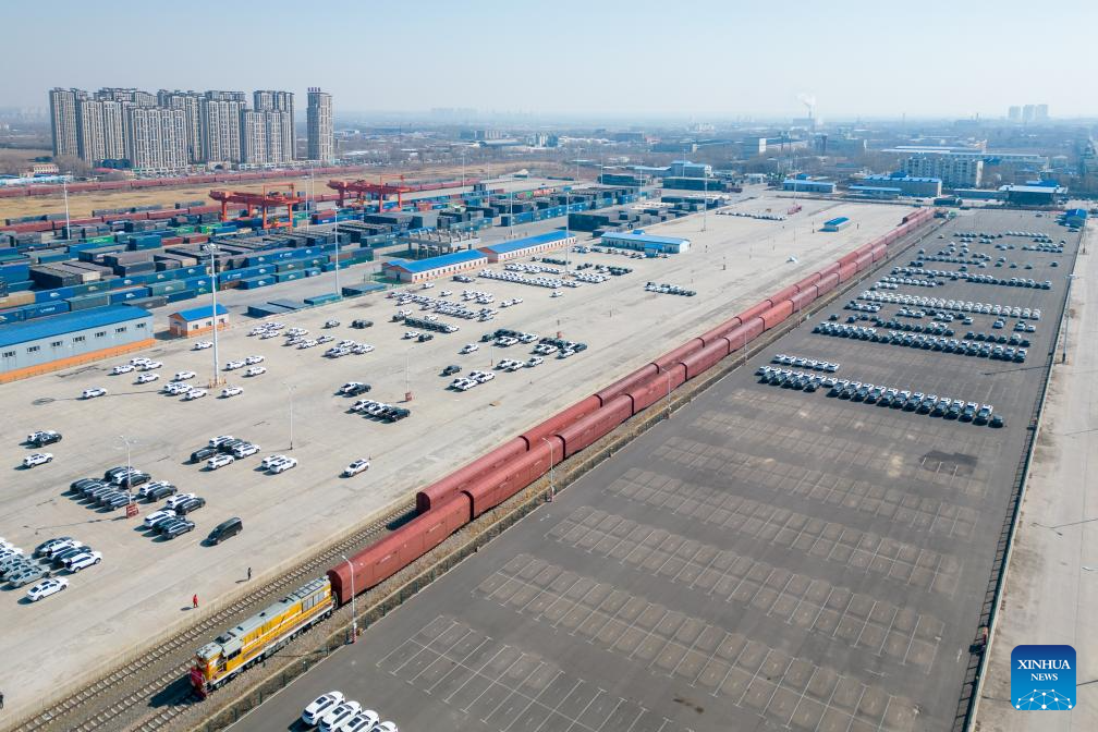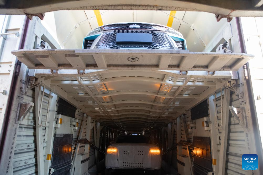 Staff members load vehicles onto a carriage of a JSQ freight train at Harbin international container center station in Harbin, capital of northeast China's Heilongjiang Province, April 8, 2024. The first JSQ freight train from Harbin to Europe, which is loaded with 290 domestic commercial vehicles from China, departed on Tuesday. The JSQ is a special train model dedicated to the transportation of automobiles. (Xinhua/Zhang Tao)