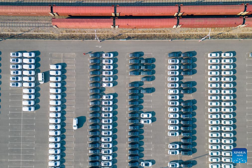 An aerial drone photo taken on April 8, 2024 shows the vehicles to be loaded onto a JSQ freight train at Harbin international container center station in Harbin, capital of northeast China's Heilongjiang Province. The first JSQ freight train from Harbin to Europe, which is loaded with 290 domestic commercial vehicles from China, departed on Tuesday. The JSQ is a special train model dedicated to the transportation of automobiles. (Xinhua/Zhang Tao)