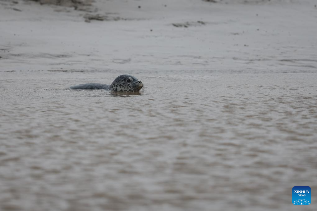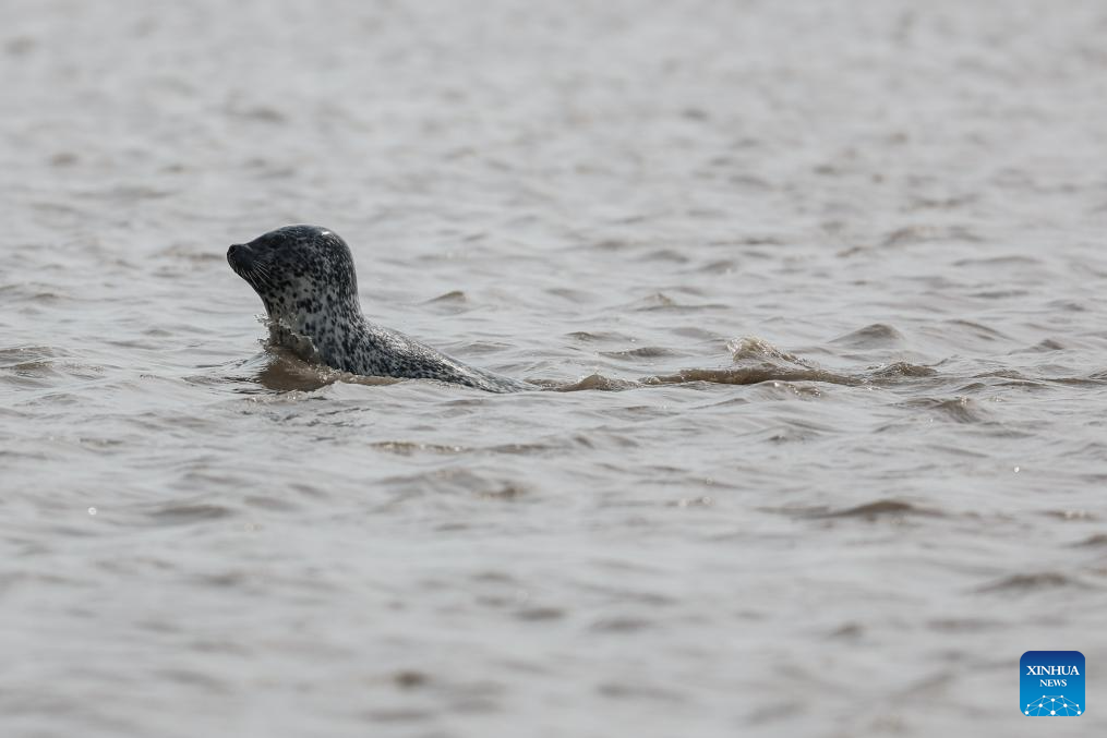 A spotted seal is seen in waters of Sandaogou in Liaodong Bay in Panjin City, northeast China's Liaoning Province, April 9, 2024. (Xinhua/Pan Yulong)