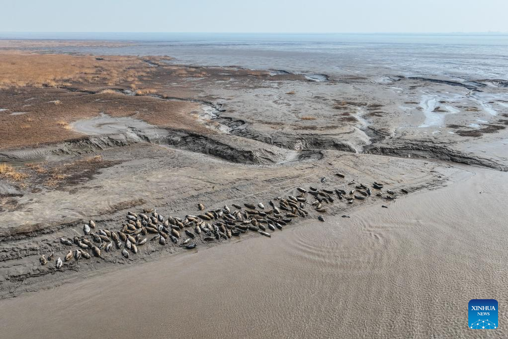 An aerial drone photo taken on April 9, 2024 shows spotted seals resting on mudflat of Liaodong Bay in Panjin City, northeast China's Liaoning Province. (Xinhua/Pan Yulong)