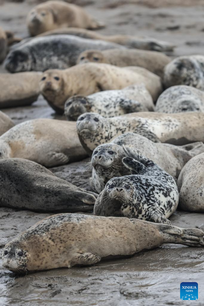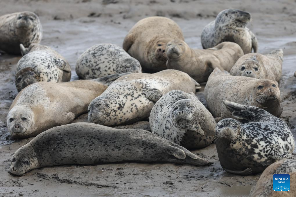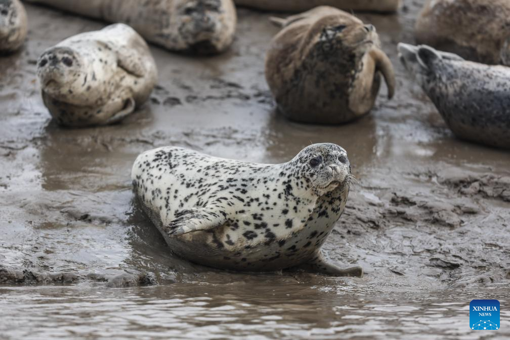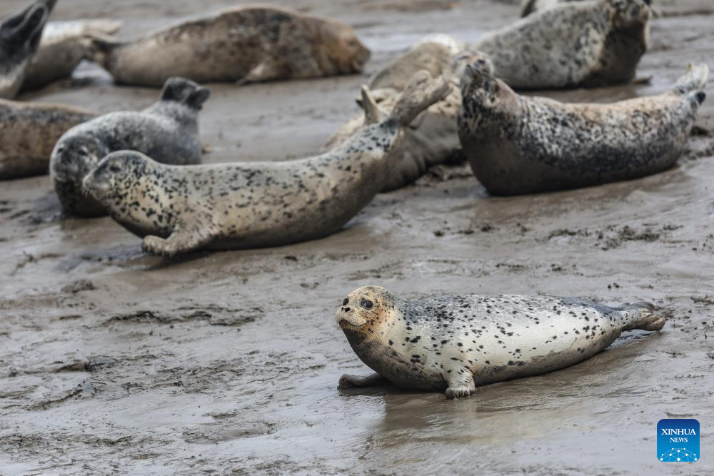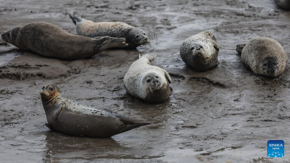 Spotted seals rest on mudflat of Liaodong Bay in Panjin City, northeast China's Liaoning Province, April 9, 2024. (Xinhua/Pan Yulong)
