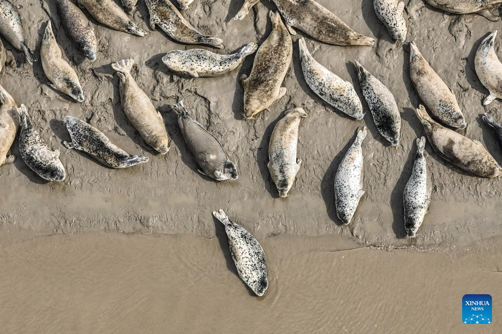 Spotted seals rest on mudflat of Liaodong Bay in Panjin City, northeast China's Liaoning Province, April 9, 2024. (Xinhua/Pan Yulong)?