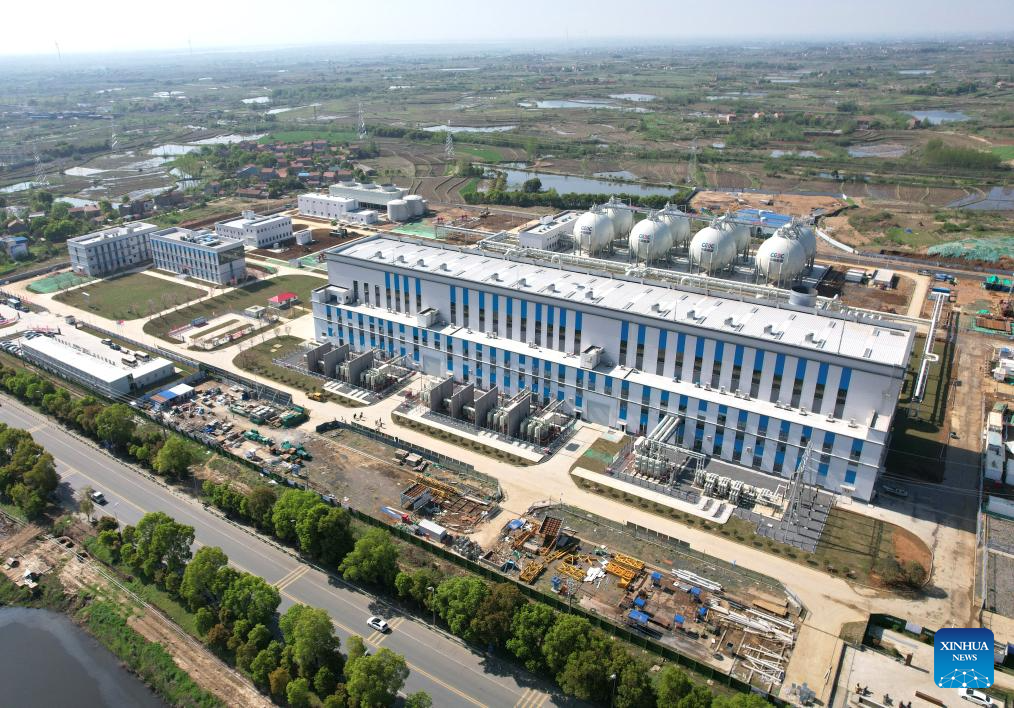 An aerial drone photo taken on April 9, 2024 shows a view of the 300 MW compressed air energy storage station in Yingcheng, central China's Hubei Province. (Xinhua/Cheng Min)?