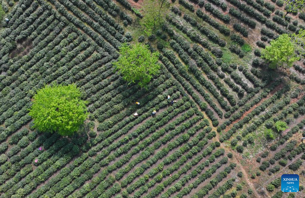 An aerial drone photo taken on April 9, 2024 shows farmers picking tea leaves at a tea garden in Feixi County of Hefei City, east China's Anhui Province. As spring unfolds, tea gardens across the region have entered the harvest season. (Xinhua/Zhou Mu)