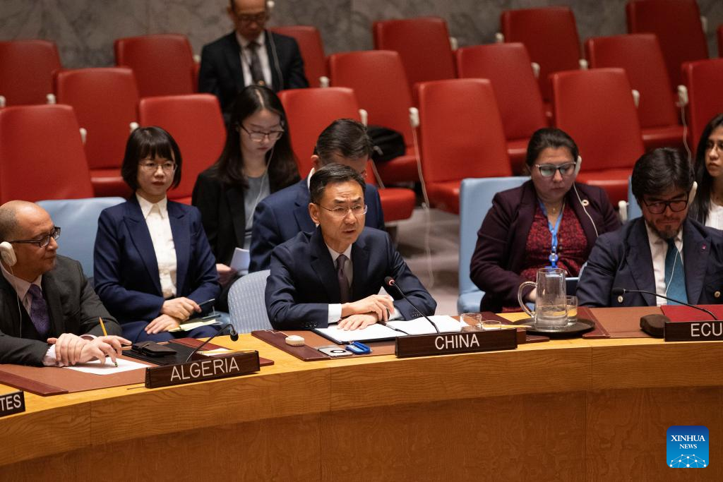 Geng Shuang (C, front), China's deputy permanent representative to the United Nations, speaks during a Security Council meeting on Colombia at the UN headquarters in New York, April 9, 2024. The Chinese envoy on Tuesday called for efforts to promote Colombia's national development and work for sustainable peace. (Xinhua/Xie E)