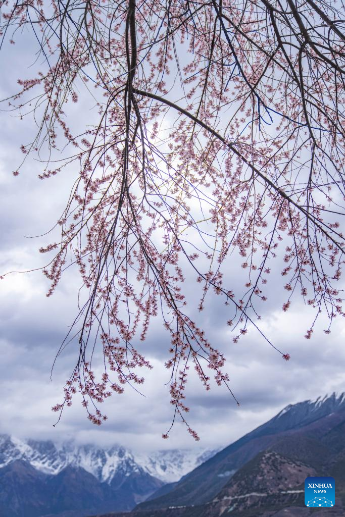 Peach flowers are seen near Suosong Village in Nyingchi, southwest China's Xizang Autonomous Region, April 2, 2024. (Xinhua/Sun Fei)