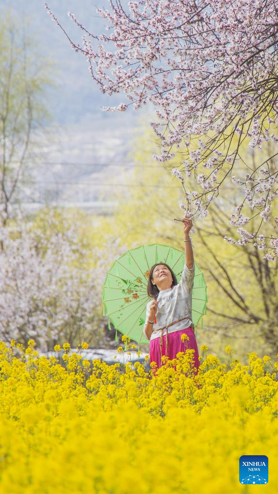 A tourist poses for photos at a cole flower field in a village of Nyingchi, southwest China's Xizang Autonomous Region, April 6, 2024. (Xinhua/Sun Fei)