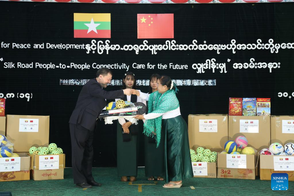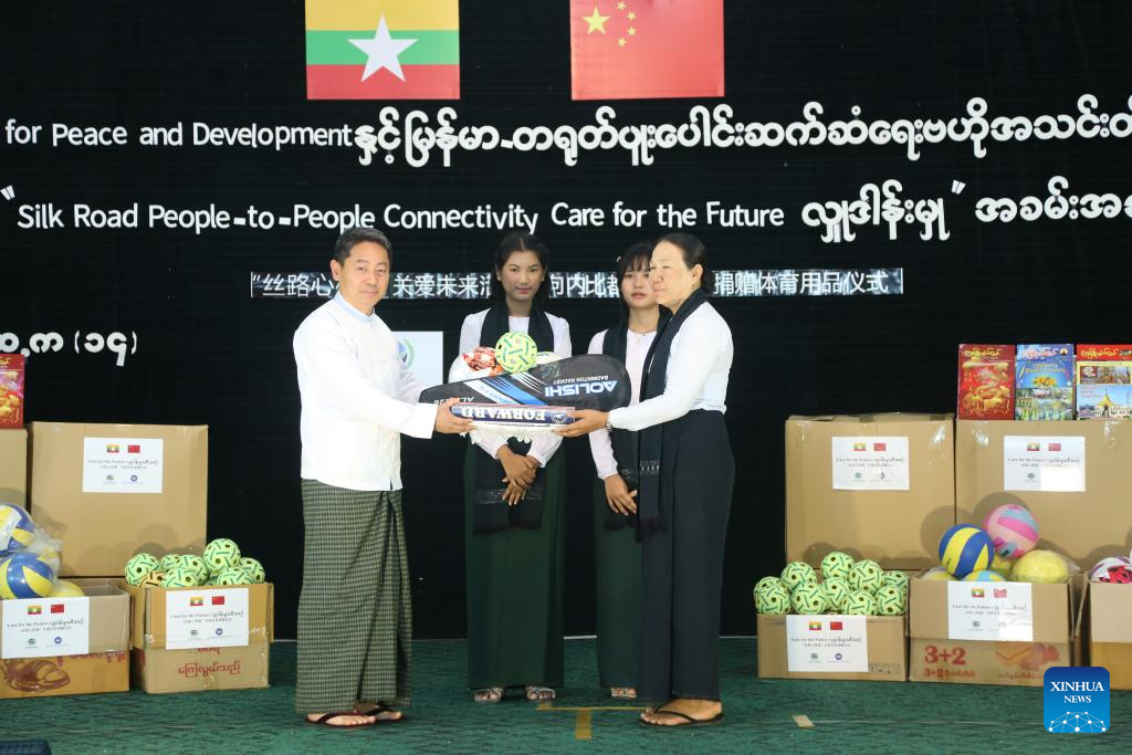 NAY PYI TAW, Myanmar, April 10 (Xinhua) -- The China Foundation for Peace and Development (CFPD) donated sports equipment to five basic education schools in Nay Pyi Taw, capital of Myanmar, on Wednesday.