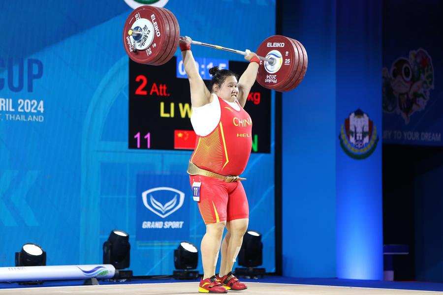 Li Wenwen of China in action in the women's +87kg category at the International Weightlifting Federation (IWF) World Cup in Phuket, Thailand on April 10, 2024. (Xinhua/Wang Teng)