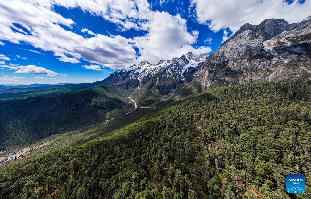 An aerial drone photo taken on March 28, 2024 shows the Lijiang Alpine Botanic Garden with the Yulong Snow Mountain, southwest China's Yunnan Province. (Xinhua/Chen Xinbo)?