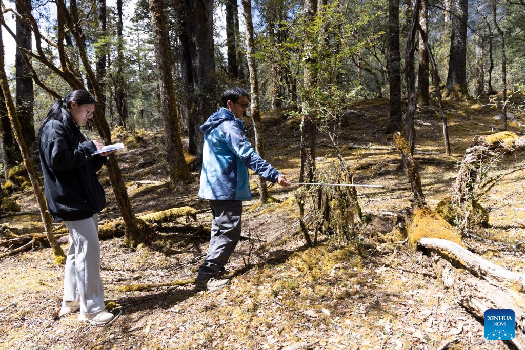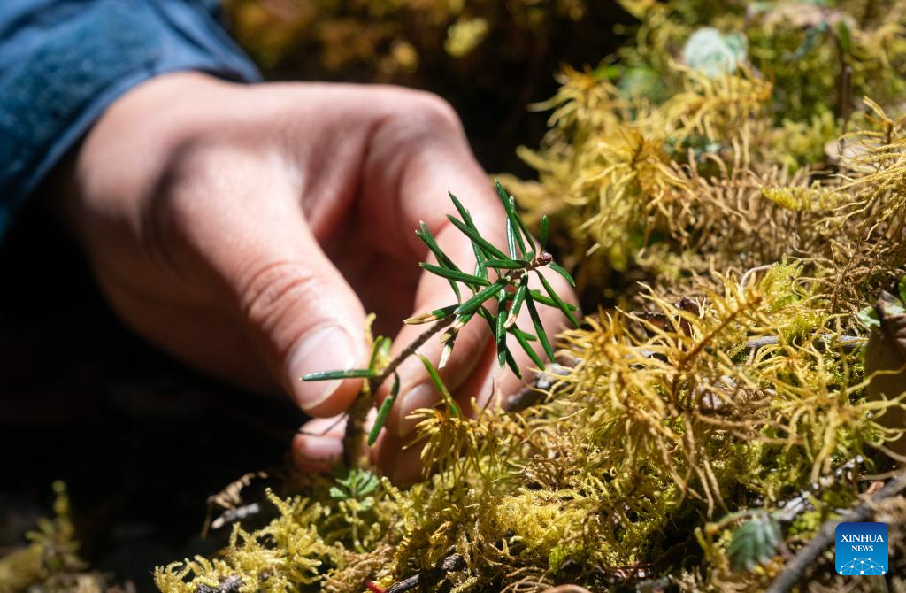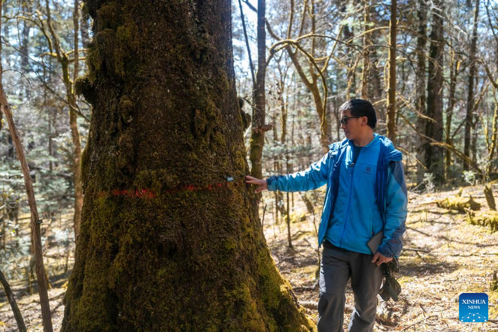 Fan Zhongyu observes a fir at a sample area in Lijiang Alpine Botanic Garden in Lijiang, southwest China's Yunnan Province, March 28, 2024. (Xinhua/Chen Xinbo)