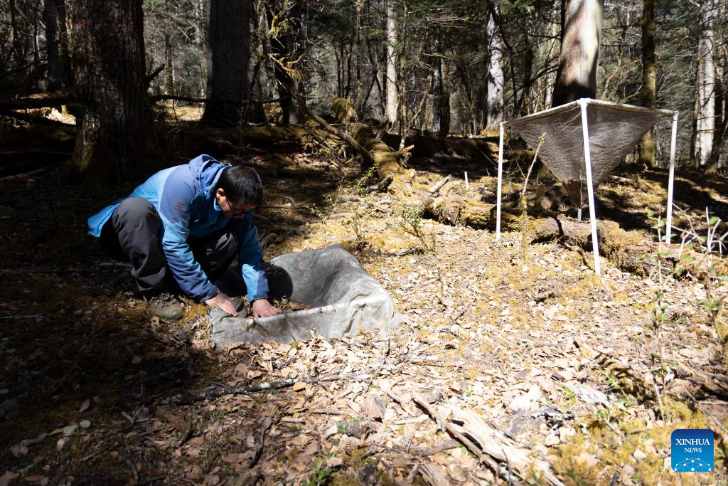 Fan Zhongyu checks an equipment for collecting seeds at a sample area in Lijiang Alpine Botanic Garden in Lijiang, southwest China's Yunnan Province, March 28, 2024. (Xinhua/Jin Liwang)