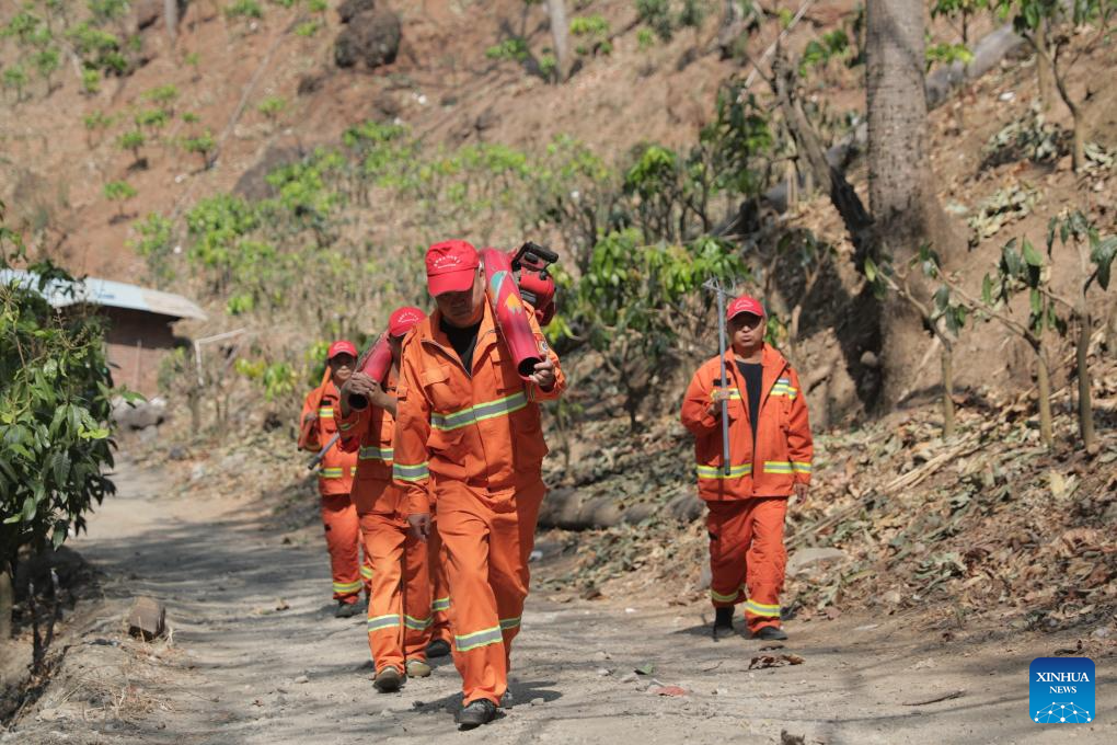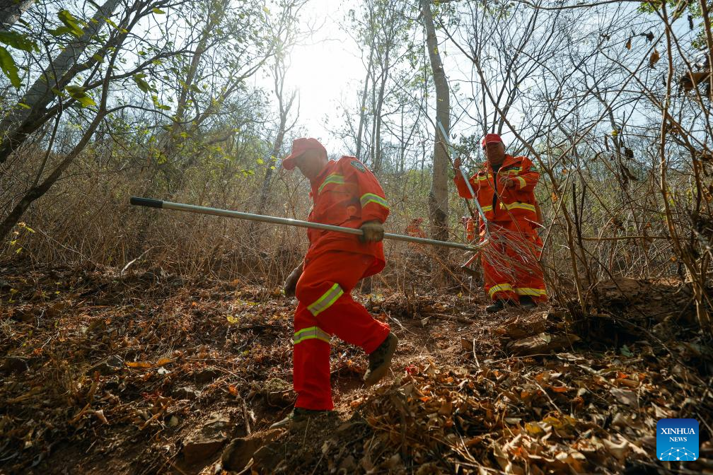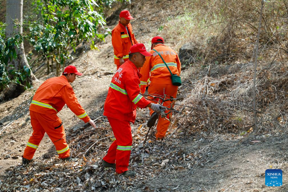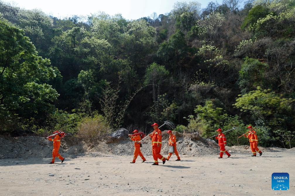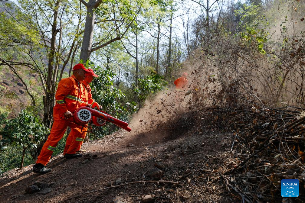 Forest rangers clear combustible as they patrol at a forest farm in Miyi County of Panzhihua, southwest China's Sichuan Province, April 10, 2024. As the high temperature and dry weather has continued since February in Miyi County of Sichuan, local forestry department has reinforced fire prevention and control work against any potential risks threatening the safety of the forest resources. (Xinhua/Shen Bohan)