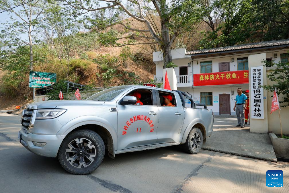 Forest rangers are on their way to patrol at a forest farm in Miyi County of Panzhihua, southwest China's Sichuan Province, April 10, 2024. As the high temperature and dry weather has continued since February in Miyi County of Sichuan, local forestry department has reinforced fire prevention and control work against any potential risks threatening the safety of the forest resources. (Xinhua/Guo Yu)