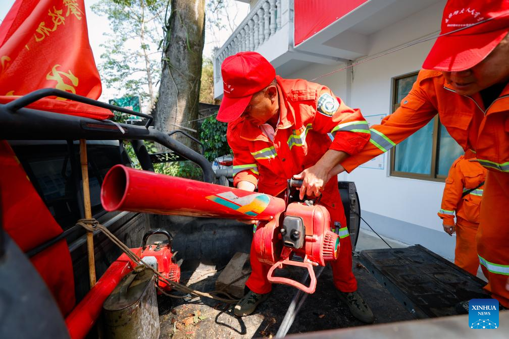 Forest rangers prepare for patrolling at a forest farm in Miyi County of Panzhihua, southwest China's Sichuan Province, April 10, 2024. As the high temperature and dry weather has continued since February in Miyi County of Sichuan, local forestry department has reinforced fire prevention and control work against any potential risks threatening the safety of the forest resources. (Xinhua/Shen Bohan)