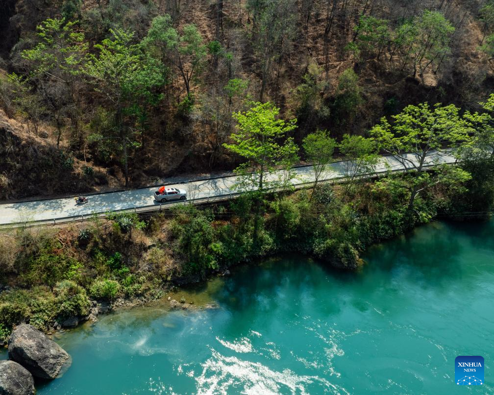 An aerial drone photo taken on April 10, 2024 shows forest rangers driving to conduct patrol at a forest farm in Miyi County of Panzhihua, southwest China's Sichuan Province. As the high temperature and dry weather has continued since February in Miyi County of Sichuan, local forestry department has reinforced fire prevention and control work against any potential risks threatening the safety of the forest resources. (Xinhua/Guo Yu)