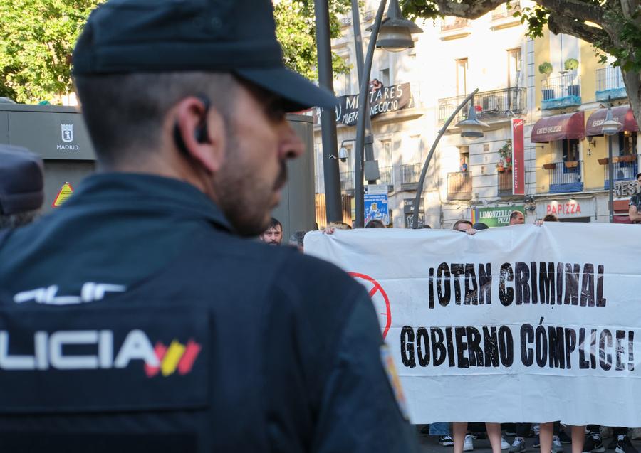 Police stand guard as demonstrators protest against the North Atlantic Treaty Organization (NATO) summit in the square of Tirso de Molina in Madrid, Spain, June 29, 2022. (Xinhua/Meng Dingbo)