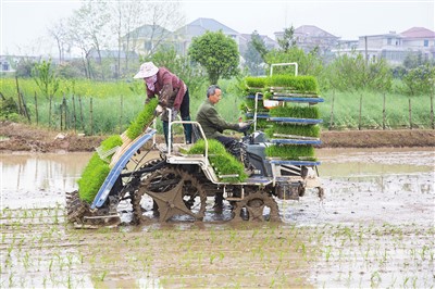 A farmer drives an agricultural machine to transplant rice seedlings in a field in Yangwan village, Cailing township, Duchang county, Jiujiang city, east China's Jiangxi Province. (Photo/Fu Jianbin)