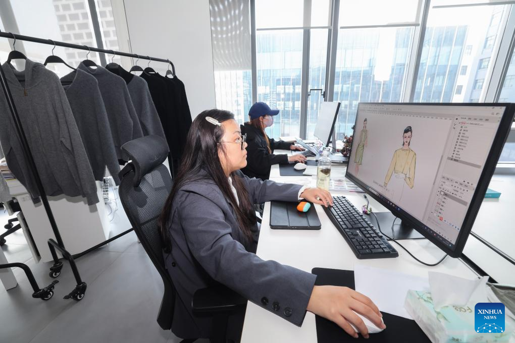 Designers work at a fashion company in the airport economy zone in Puyuan Town of east China's Zhejiang Province, April 9, 2024. (Xinhua/Xu Yu)
