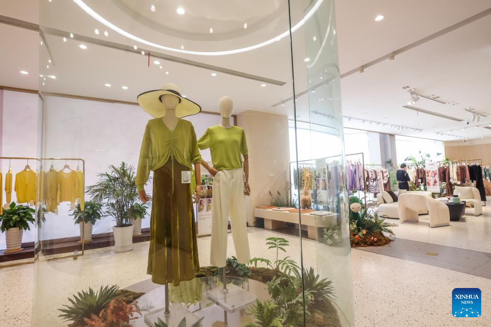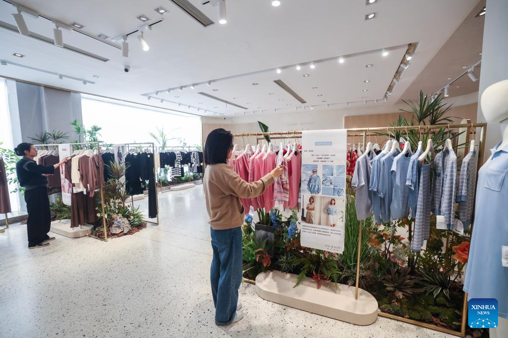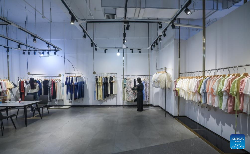 This photo taken on April 9, 2024 shows an exhibition hall of a garment company in Puyuan Town of east China's Zhejiang Province. (Xinhua/Xu Yu)