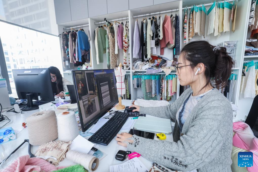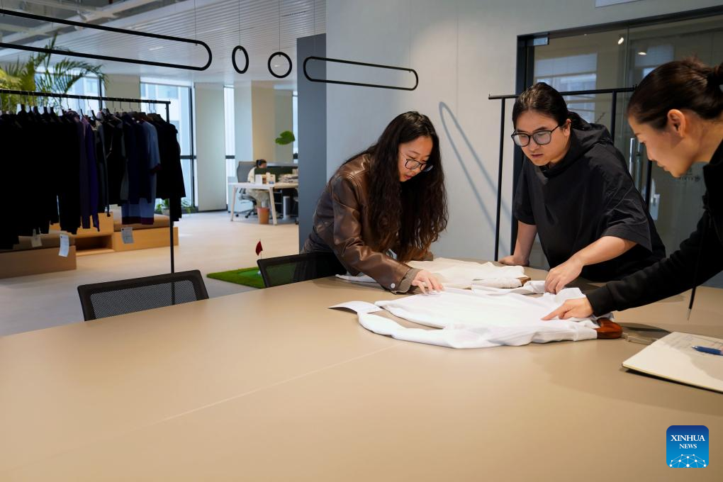 Designers of a fashion company from Puyuan Town of east China's Zhejiang Province work on new designs at its office in east China's Shanghai, April 9, 2024. (Xinhua/Liu Ying)