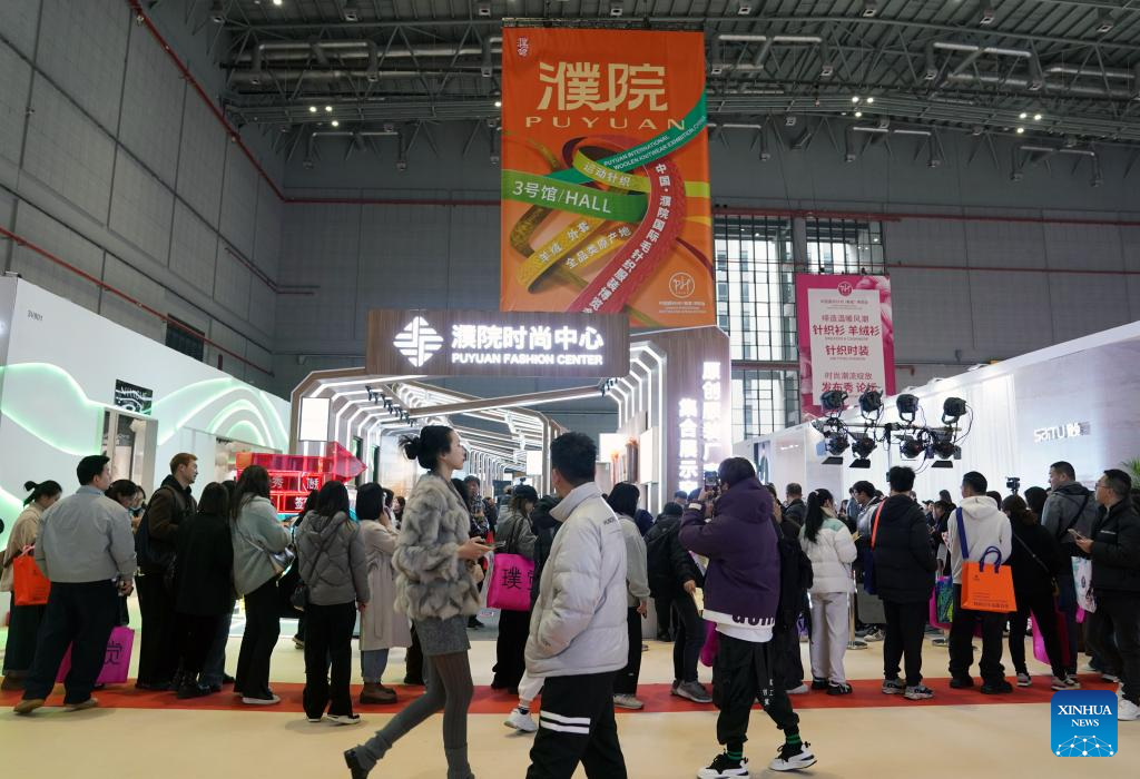 Merchants visit the booth of a company from Puyuan Town of east China's Zhejiang Province during the spring edition of China International Knitting Fair in east China's Shanghai, March 6, 2024. (Xinhua/Liu Ying)