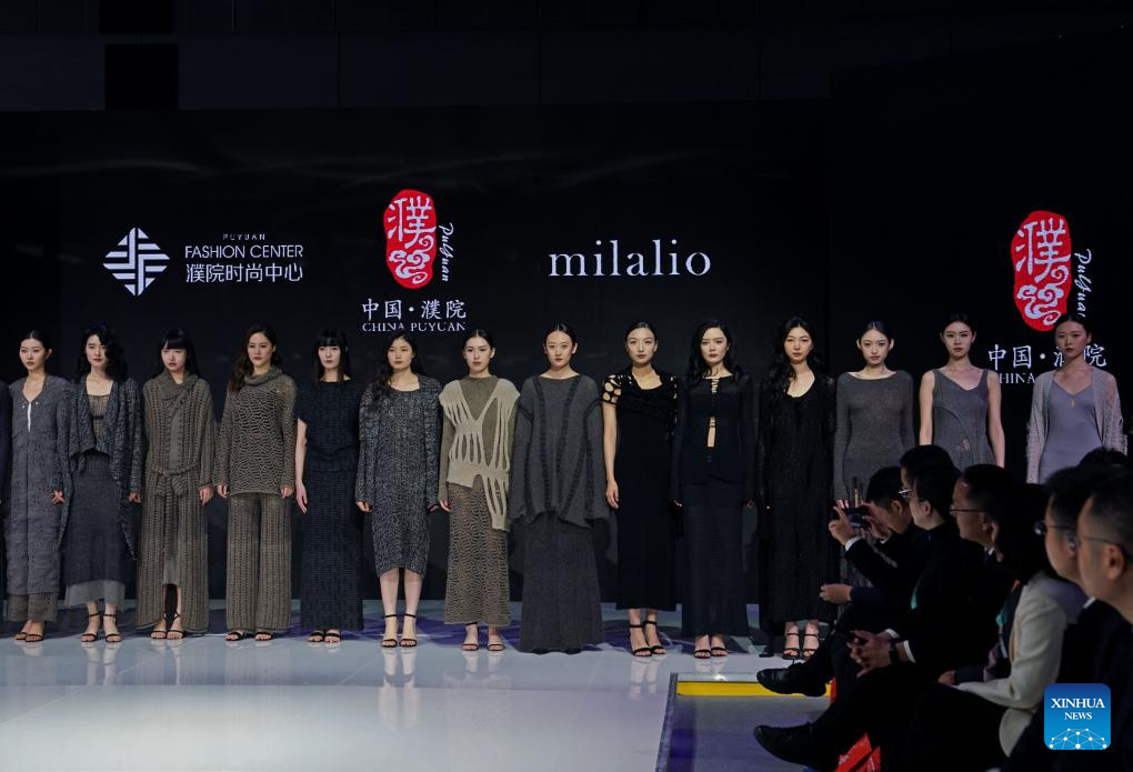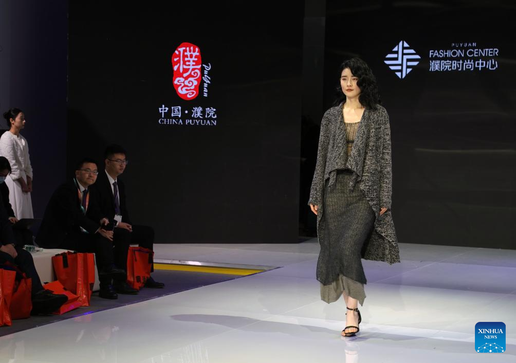 Models stage a knitwear show presenting products from companies from Puyuan Town of east China's Zhejiang Province during the spring edition of China International Knitting Fair in east China's Shanghai, March 6, 2024. (Xinhua/Liu Ying)