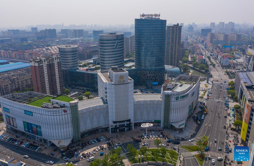 An aerial drone photo taken on April 9, 2024 shows the building of a knitwear market in Puyuan Town of east China's Zhejiang Province. (Xinhua/Xu Yu)