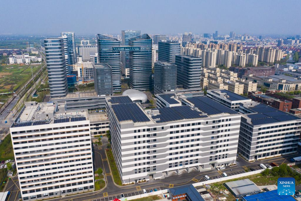An aerial drone photo taken on April 9, 2024 shows the airport economy zone in Puyuan Town of east China's Zhejiang Province. (Xinhua/Xu Yu)