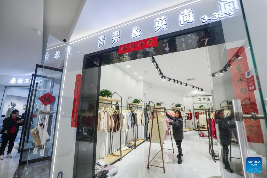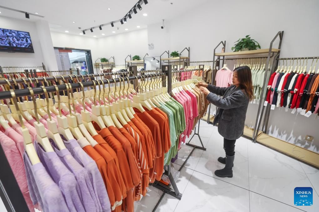 A shop owner arranges knitwear garments at a knitwear market in Puyuan Town of east China's Zhejiang Province, April 9, 2024. (Xinhua/Xu Yu)