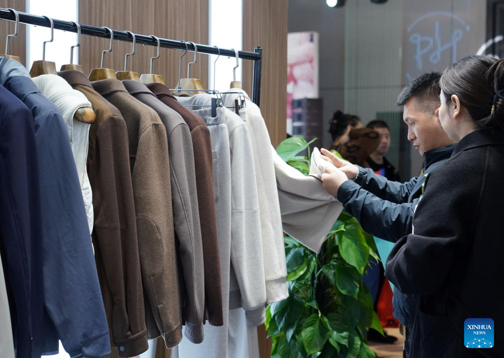 Visitors look on in a dedicated area where a total of 42 knitwear companies, shops and designer brands from Puyuan Town of east China's Zhejiang Province take part in the spring edition of China International Knitting Fair in east China's Shanghai, March 6, 2024. (Xinhua/Liu Ying)