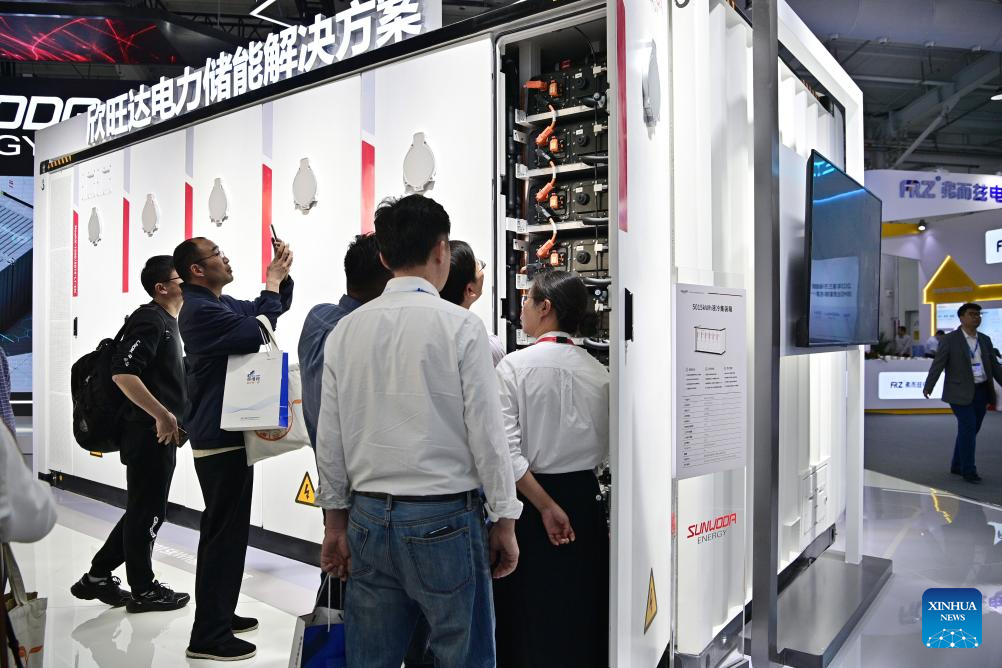 People visit the booth of Sunwoda at the 12th Energy Storage International Conference and Expo (ESIE) at Shougang Exhibition and Convention Center in Beijing, capital of China, April 11, 2024. The 12th ESIE, opening from April 10 to 13, features an exhibition area of more than 150,000 square meters. (Xinhua/Yin Dongxun)