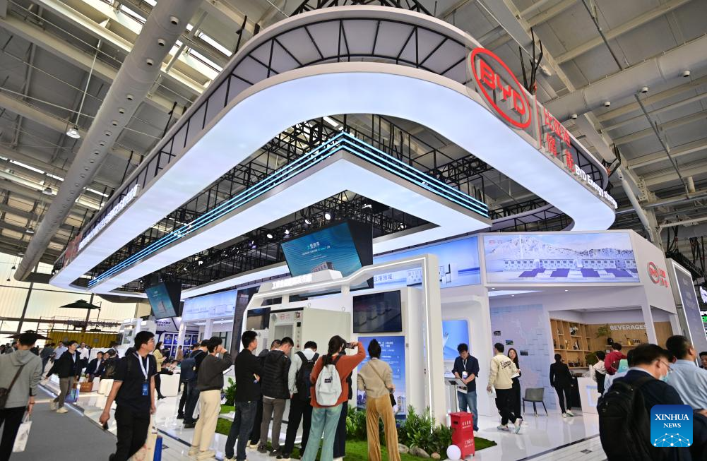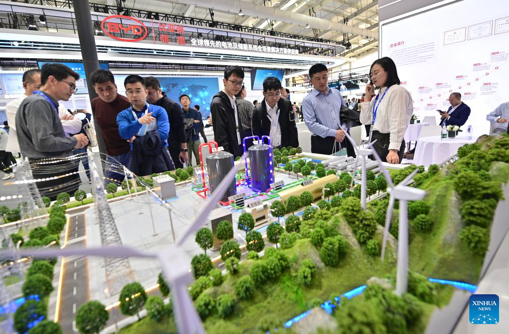 People visit the booth of BYD at the 12th Energy Storage International Conference and Expo (ESIE) at Shougang Exhibition and Convention Center in Beijing, capital of China, April 11, 2024. The 12th ESIE, opening from April 10 to 13, features an exhibition area of more than 150,000 square meters. (Xinhua/Yin Dongxun)