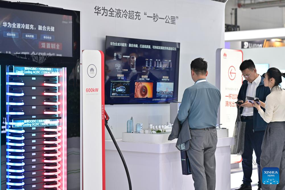 People visit the booth of Huawei at the 12th Energy Storage International Conference and Expo (ESIE) at Shougang Exhibition and Convention Center in Beijing, capital of China, April 11, 2024. The 12th ESIE, opening from April 10 to 13, features an exhibition area of more than 150,000 square meters. (Xinhua/Yin Dongxun)
